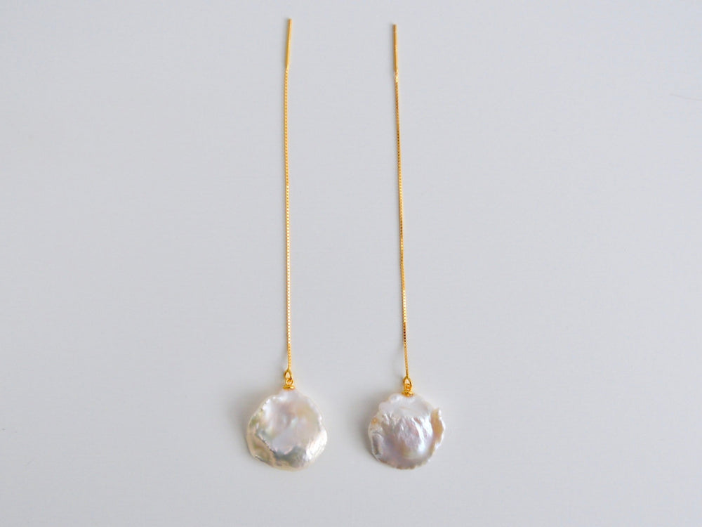 Große Liebe für Ohrketten: An den schlichten Ohrkettchen - auch Pull Through oder Threader genannt - aus 925 Sterling Silber hängen individuell gewachsene runde Barockperlen. Ideal für Frauen, die Spaß an besonderen Schmuckstücken haben.