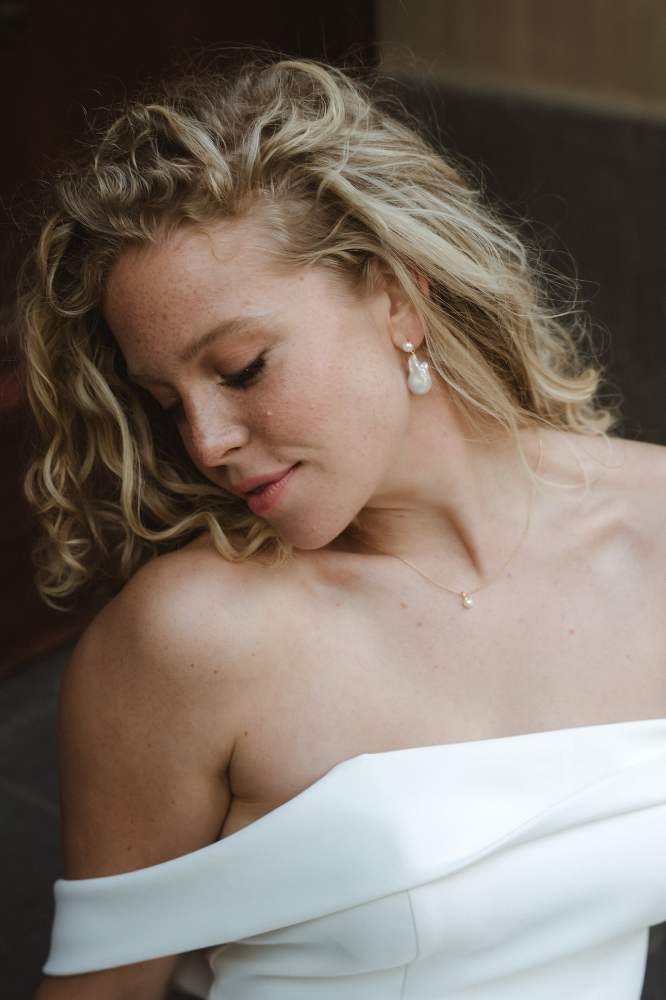 Ach als dezenter Brautschmuck ganz wunderbar geeignet, wie man an unserem bezaubernden Model sieht. Hier haben wir diese Ohrringe und diese Haarnadel dazu kombiniert.