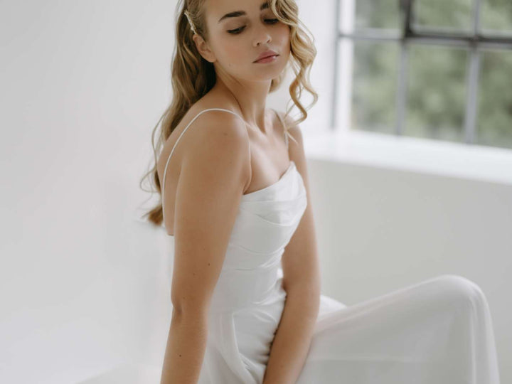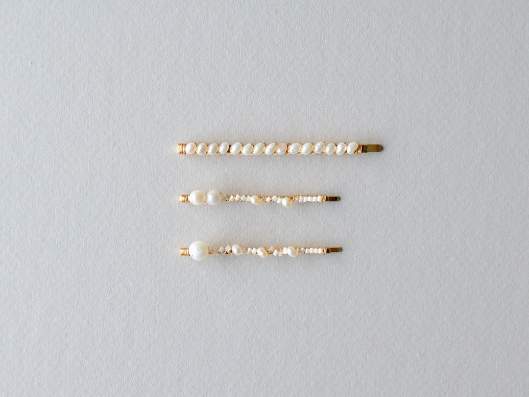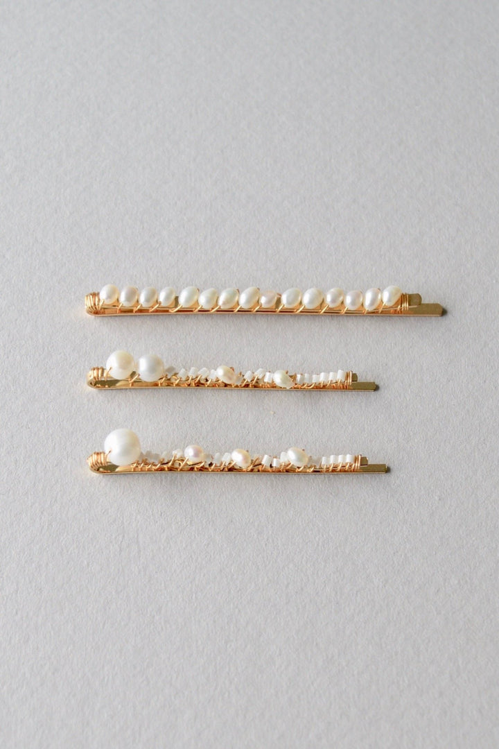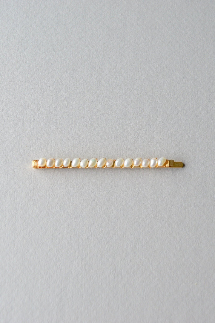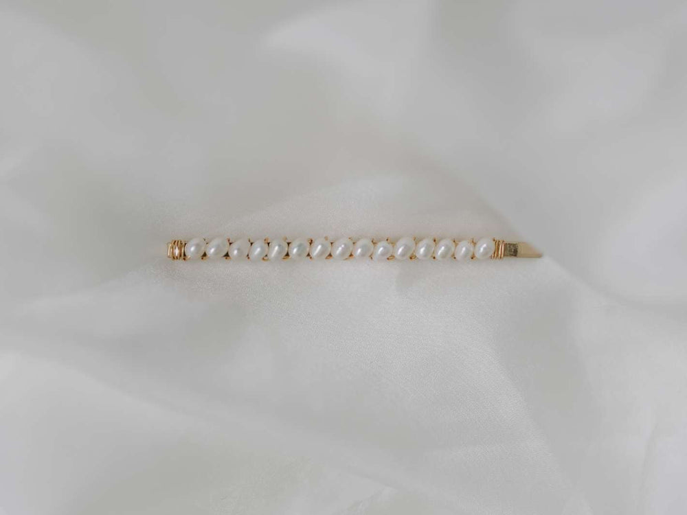 Große Liebe für Airin! Die schlichte Haarklammer edelt jede Brautfrisur. Ob seitlich im Low Bun getragen oder zum Sleek Look: der Haarschmuck mit unregelmässig gewachsenen Süßwasserperlen ist immer eine gute Wahl.