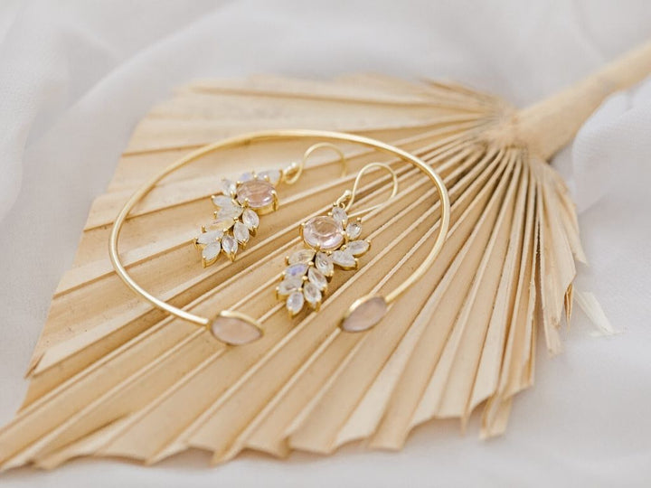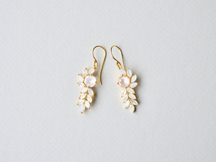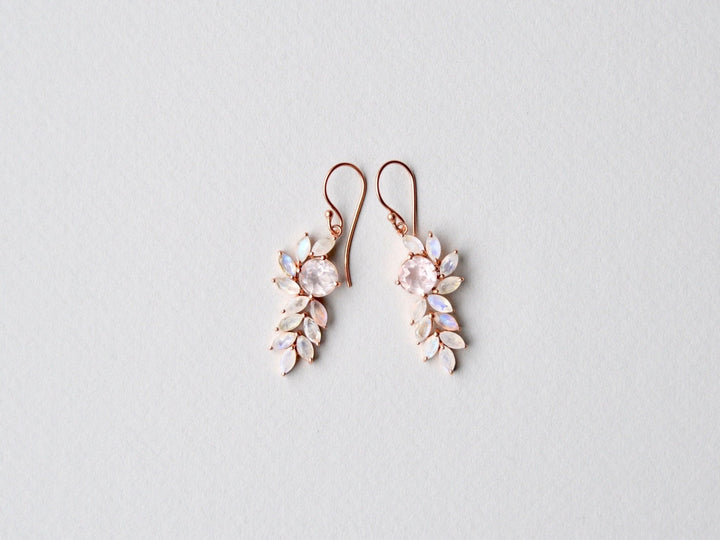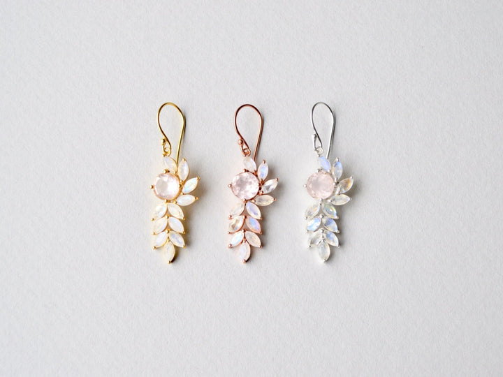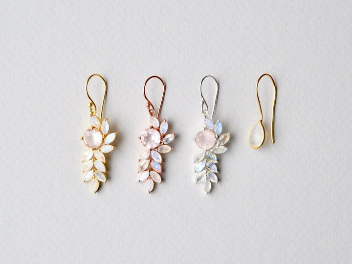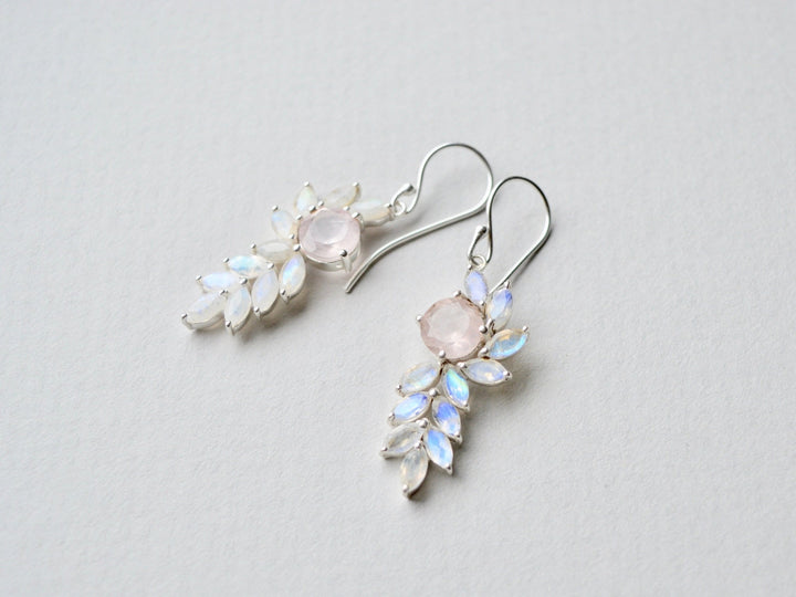 Say hello to Audrey: Diese Ohrhänger sind ein absoluter Traum! Hier stehen zwei der wahrscheinlich femininsten Halbedelsteine im Mittelpunkt: der geschliffene Rosenquarz wird flankiert von bläulich schimmernden Regenbogen-Mondsteinen, die Steine sind mit 925 Sterling Silber eingefasst.