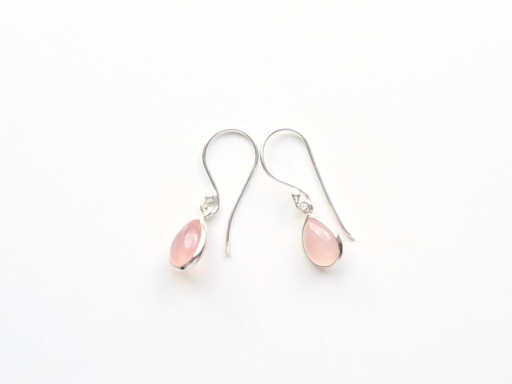 Der tropfenförmige polierte rosa Chalcedon baumelt an einem schlichten Ohrhaken aus 925 Sterling Silber.