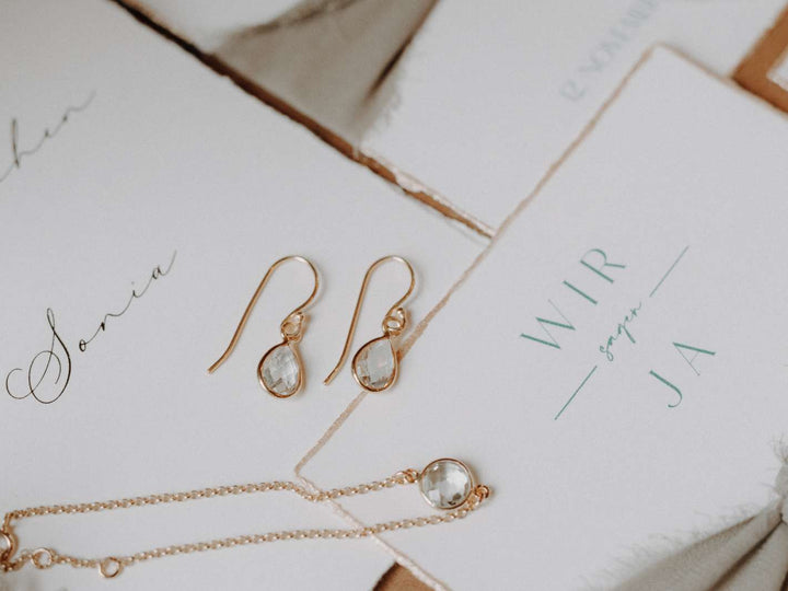 Das Armband ist ganz wunderbar als Brautschmuck geeignet. Wir mögen den transparenten Halbedelstein aus der Gruppe der Quarze übrigens auch sehr gerne in Kombination mit Perlen, Rosenquarz und grünem Onyx.