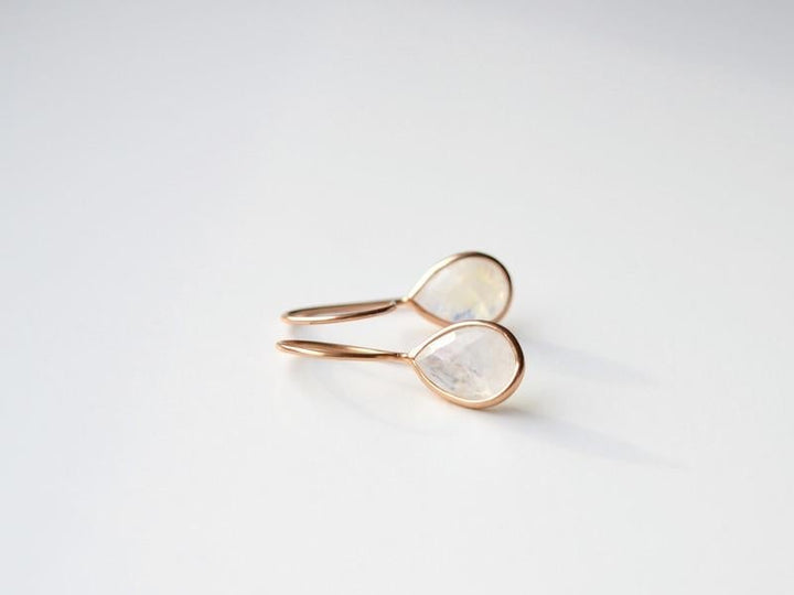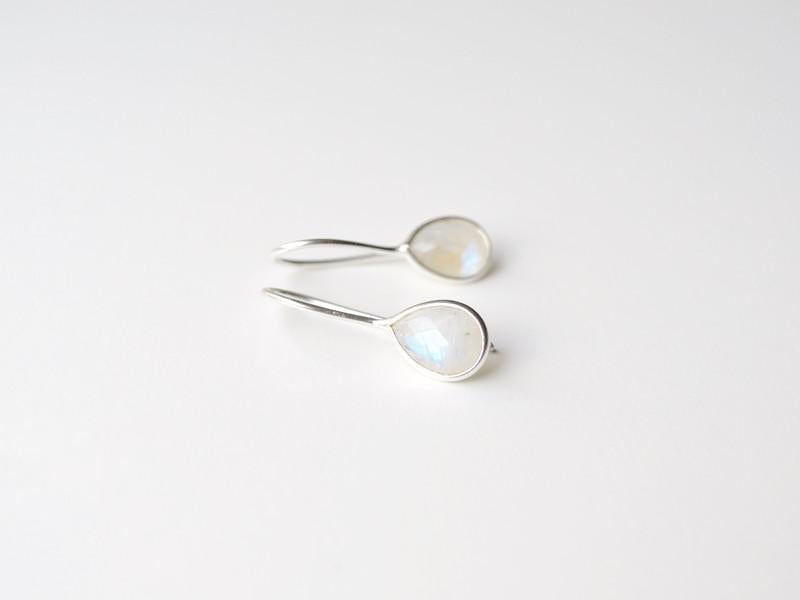 Ein ganz bezaubernder Ohrhänger: Der tropfenförmig facettierte Regenbogen-Mondstein hängt an einem zierlichen schlichten Ohrhaken.